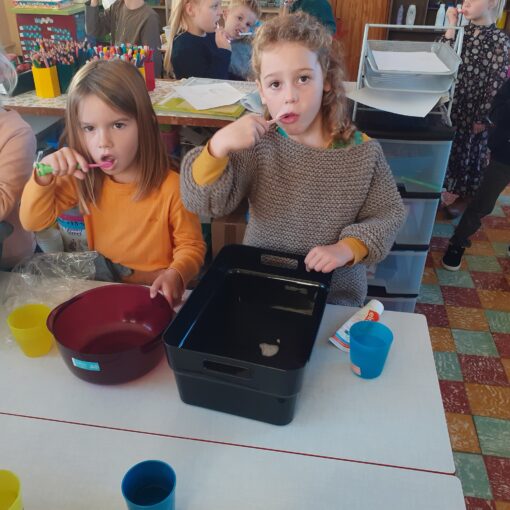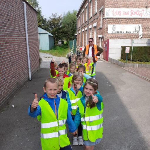 Tijdens een leuke wandeling leerden we heel wat verkeersborden kennen. We oefenden ook om veilig over te steken.